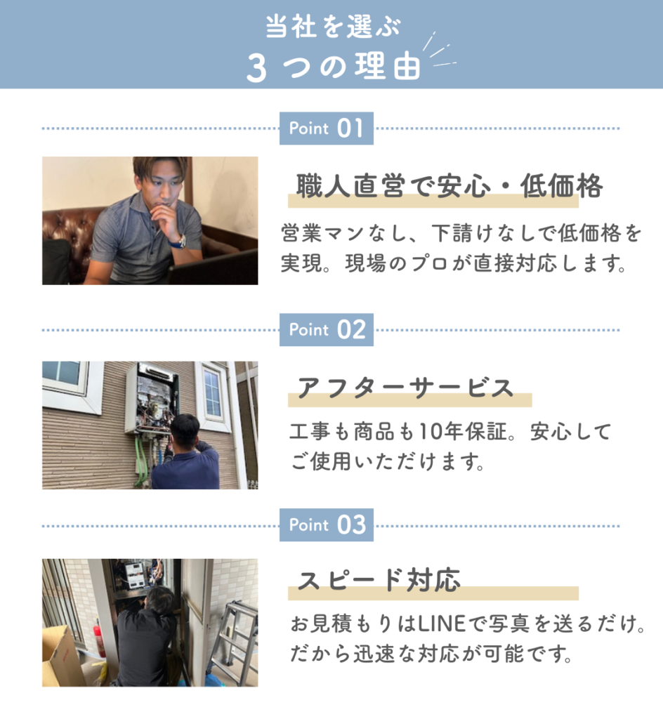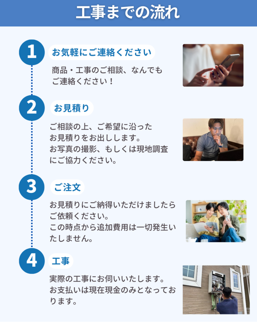 東京・神奈川にて各種住宅設備機器の交換工事を行なっています。取り扱い商材が多く、同時工事でお値引きも行なっています。お出しするお見積りから追加費用は一切頂きません。しつこい営業も行いませんので、お気軽にお問い合わせください。
